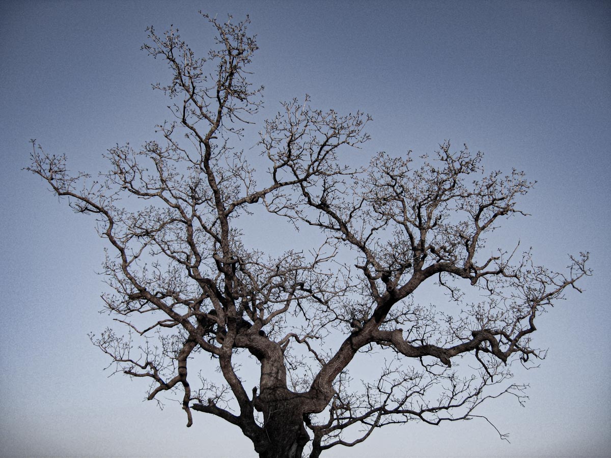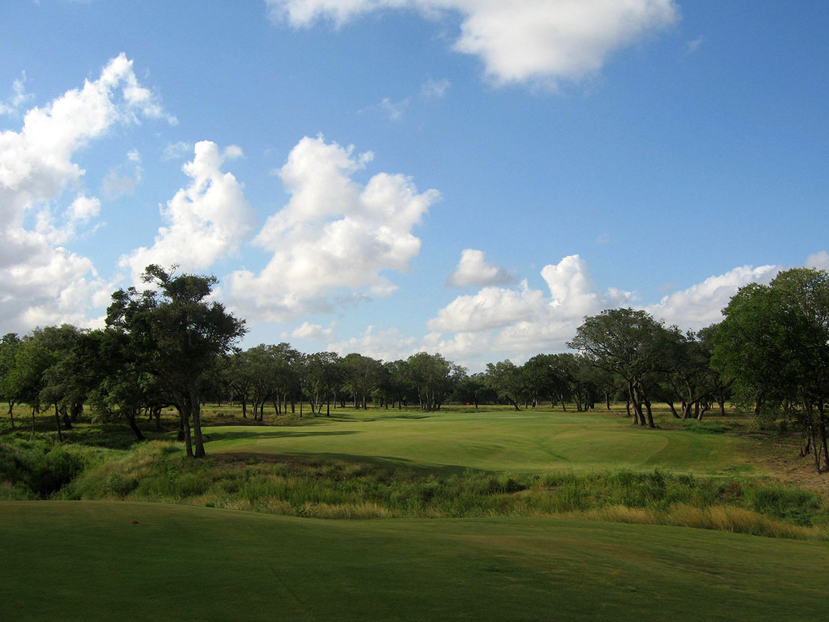 Looking back on the 14th hole, the large live oak splits the fairway.